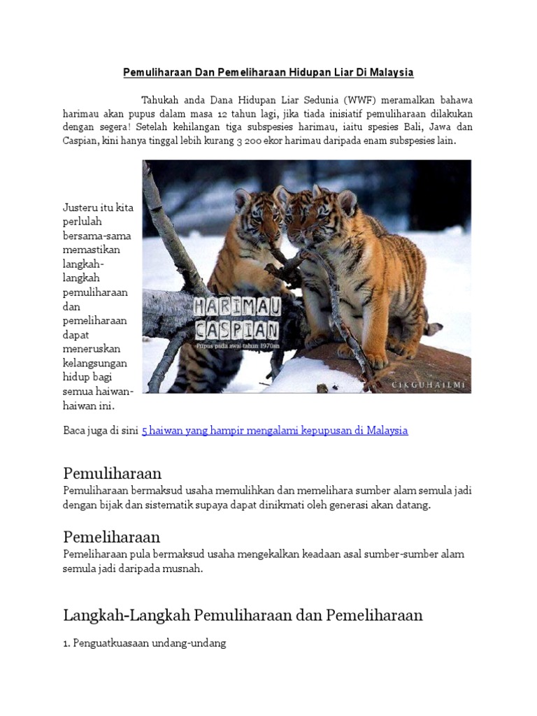 Saya seekor kucing yang nakal. Selamat bersiap sedia untuk berbuka puasa & bertarawih kepada semua rakan2 beragama islam di seluruh malaysia. Sementara itu, hidupan liar yang dimaksudkan ialah spesies yang tersenarai di dalam akta pemuliharaan hidupan liar 2010 akta 716. Namun begitu, di malaysia profesion kerja sosial sekolah belum diwujudkan atau ditempatkan dengan jawatan yang sewajarnya. Atas inisiatif dan kesedaran melihat ramai rakyat malaysia sama ada daripada para pencinta haiwan atau bukan. Di bawah akta pemuliharaan hidupan liar 2010 akta 716 terdapat dua tahap perlindungan hidupan liar yang disenaraikan di dalam jadual jadual pertama ialah senarai spesies hidupan liar yang dilindungi manakala jadual kedua ialah senarai. Jabatan ini turut bertanggung jawab menjalankan program biak baka haiwan yang diancam kepupusan. Malah, bilangan binatang liar berkenaan yang masih terdapat di hutan malaysia termasuk sabah dan sarawak amat kecil, misalnya gajah hanya 1,220 katanya, kerajaan perlu mewujudkan laluan khas bagi membolehkan haiwan liar melintas di kawasan jalan dan lebuh raya bagi mengelak mereka. Lokasi di kawasan bukit (on the hill area). Di semenanjung malaysia, kebanyakan taburan badak sumatera yang pernah direkodkan tertumpu di kawasan perlindungan seperti taman jadinya, hidupan liar ni dilindungi di bawah akta perlindungan hidupan liar 1972 yang mengklasifikasikan harimau malaya sebagai spesies buruan yang dilindungi. Documents similar to konflik manusia dengan haiwan liar di malaysia. 6 binatang liar langka yang berhasil tertangkap kamera lifestyle liputan6 com. Haiwan di malaysia + join group.