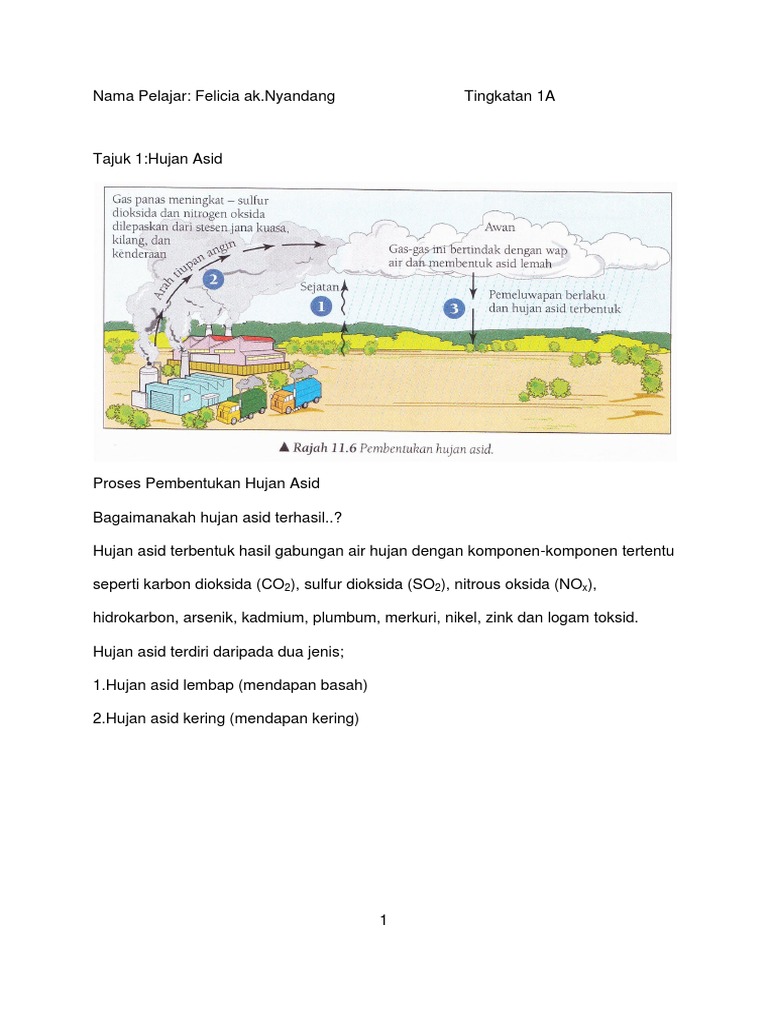 Hujan asid adalah hujan yang mempunyai nilai ph kurang daripada 5? Sejak beberapa ratus tahun yang lalu, kita telah membakar khazanah bahan organik. Apr 14, 2015 · a) kegiatan perindustrian peningkatan kegiatan perindustrian di seluruh dunia telah meningkatkan kadar kejadian hujan asid. Masalah ini mengakibatkan kemerosotan kualiti tanah, kepupusan hutan dan ancaman kepada hidupan liar. Asap kilang yang dilepaskan ke udara mengandungi bahan pencemar seperti sulfur dioksida serta nitrogen dioksida dan kemudian bahan ini akan bercampur dengan wap air lalu membentuk kerpasan yang turun sebagai hujan asid.